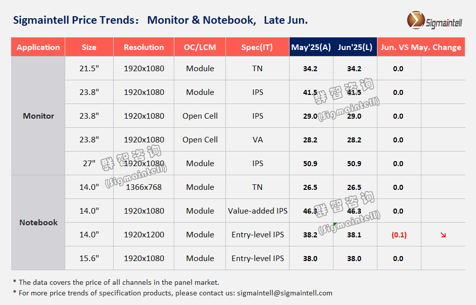 23.8"FHD,6月 Open cell & LCM面板价格止涨企稳;