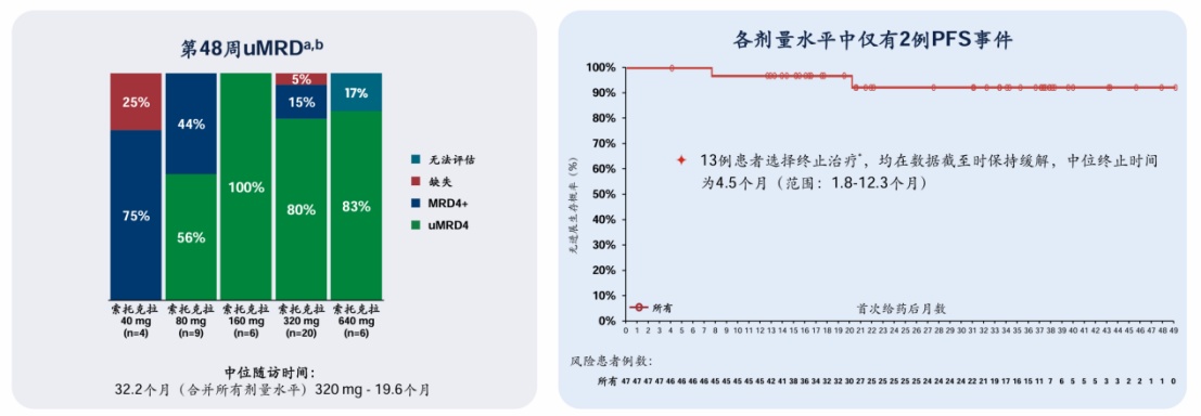 值得一提的是,在索托克拉联合泽布替尼治疗R/R CLL/SLL过程中,在RP2D的320mg剂量下,uMRD达到80%,在研究所有剂量水平下仅发生2例疾病进展事件发生。该数据与目前其他固定疗程数据对比显示出了显著的潜在同类最佳属性。