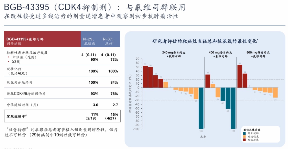 例如针对乳腺癌和妇科癌症,百济神州研发的一款具备FIC潜力CDK4抑制剂BGB-43395,在单药治疗及与氟维司群和来曲唑的联合用药治疗展现出良好的安全性。