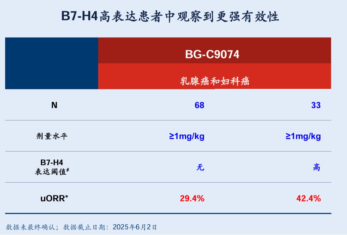 而另一款首创新药B7H4 ADC药物BG-C9074则在乳腺癌和妇科肿瘤中实现高表达、差异化的ADC设计,在异质性(低和高表达)临床前模型中表现出良好的有效性,其在乳腺癌和妇科肿瘤中ORR达29.4%,且在B7-H4表达水平较高的患者中缓解率更高,达到42.4%,显示出了明显的早期抗肿瘤活性且安全性可控。