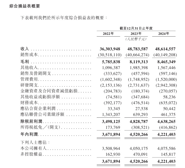 业绩方面,于2022年度、2023年度、2024年度,亿纬锂能实现收入分别约为363.04亿元、487.84亿元、486.15亿元人民币;同期,年内利润分别为36.72亿元、45.2亿元、42.21亿元人民币。