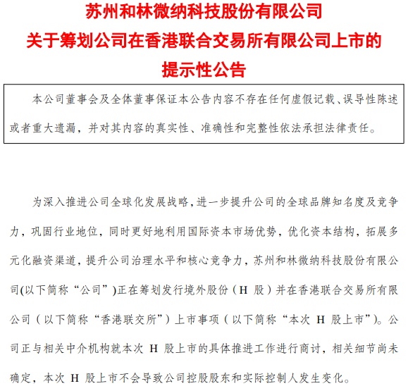 智通财经APP获悉,6月30日,和林微纳(688661.SH)公告称,为深入推进公司全球化发展战略,进一步提升公司的全球品牌知名度及竞争力,巩固行业地位,同时更好地利用国际资本市场优势,优化资本结构,拓展多元化融资渠道,提升公司治理水平和核心竞争力,公司正在筹划发行境外股份(H股)并在香港联合交易所有限公司上市事项。相关细节尚未确定,本次H股上市不会导致公司控股股东和实际控制人发生变化。
