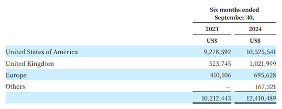 而在截至2024年9月的半年内,金电科技的营收约1241万美元,同比增长约21.5%,收入增加主要是美国和英国的销售额增加到1154.75万 美元。期内,毛利润约161万美元,净利润约58.6万美元,较上年同期有些许下滑。