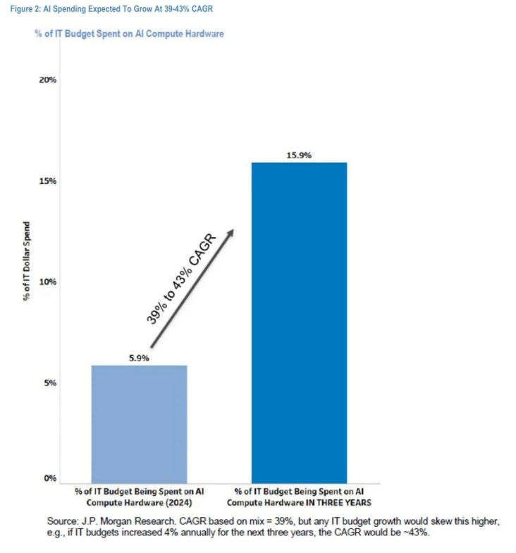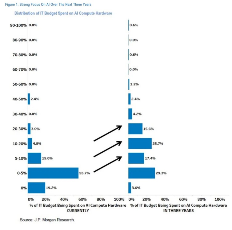 调查结果提供了几个关键点,小摩认为这些点支持了由AI加速计算数据中心建设推动的持续强劲的云资本支出增长。首先,反馈显示未来三年对AI的强烈关注——68%的受访者打算在未来三年内将超过5%的IT预算用于AI计算硬件。其次,作为CIO IT预算百分比的AI相关计算支出意图在未来三年内看起来将增加到15.9%,而目前约为5.9%,这意味着年复合增长率为41%,这一增长率优于小摩的XPU(GPU、TPU、DPU)半导体收入增长预期的30-35%。