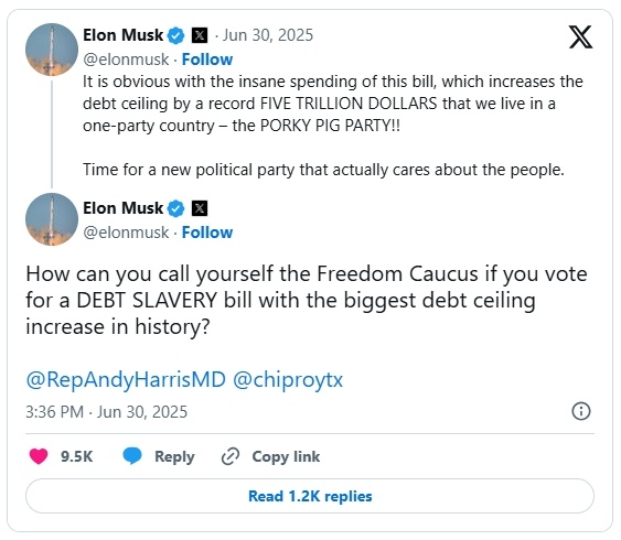 智通财经APP获悉,周一,马斯克再次猛烈抨击该法案,直言它是“债务奴役法案”,并点名批评了支持该法案的共和党议员。