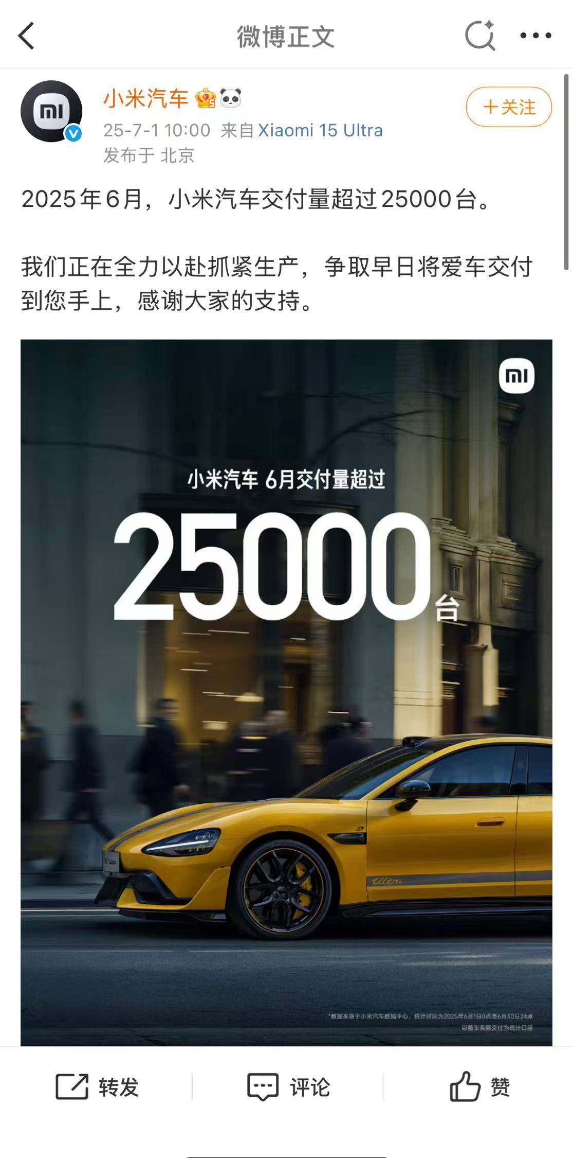 智通财经APP获悉,7月1日,据小米汽车微博消息,2025年6月,小米汽车交付量超过25000台。