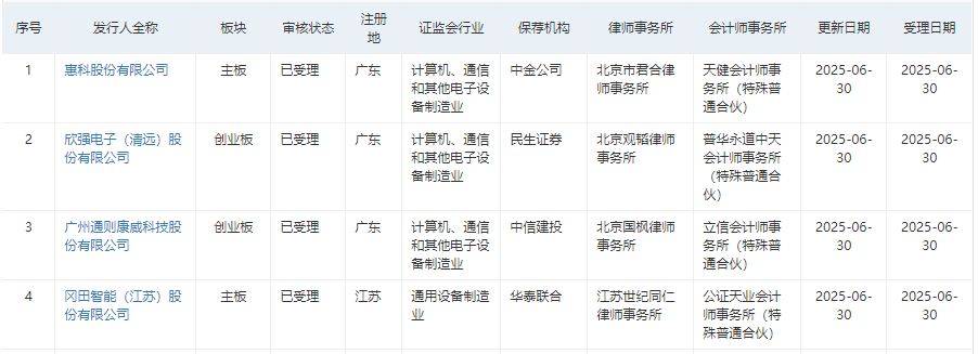 智通财经APP获悉,6月30日,深交所披露,惠科股份有限公司(惠科股份)、欣强电子(清远)股份有限公司(欣强电子)、广州通则康威科技股份有限公司(通则康威)、冈田智能(江苏)股份有限公司(冈田智能)深交所IPO申请已获受理。