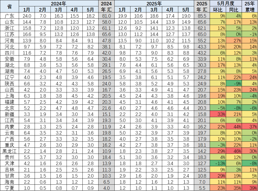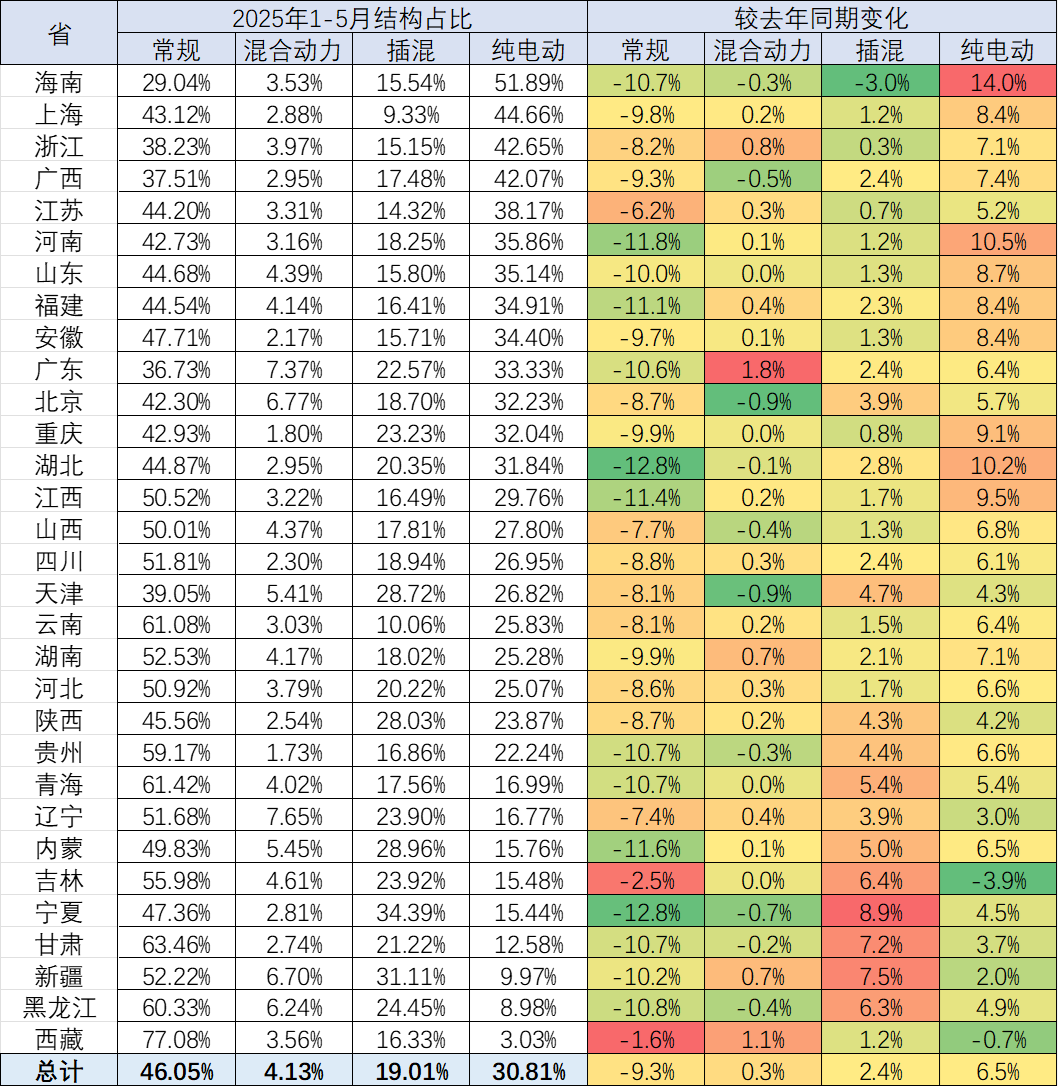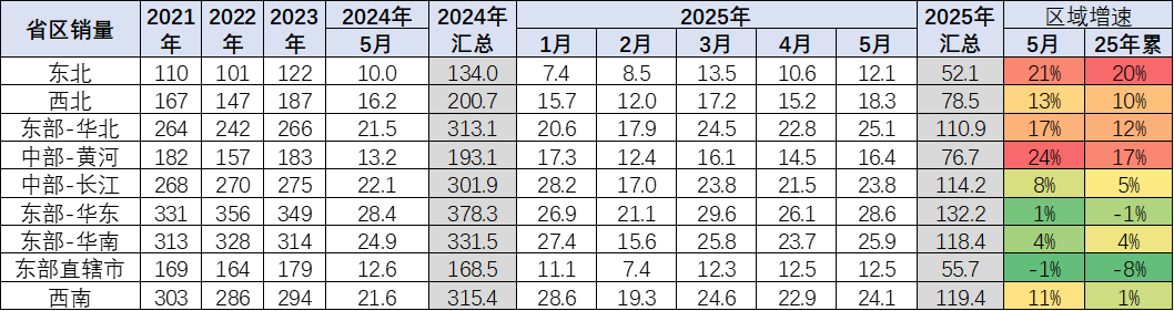 2025年新能源车表现相对较强,尤其纯电动、插电混动两者表现均是较好的态势。目前,传统油车在中西部和北方需求仍然比较大,燃油车占比还达到60%左右的比例,而在东部的平原地区,尤其是南方地区,整体的新能源车占比就到50%以上的水平。5月的北方地区增长较快也是插混占比提升明显的地方,体现新能源的拉动。