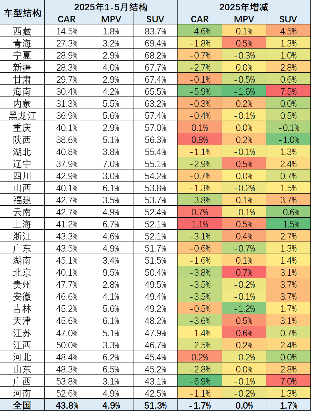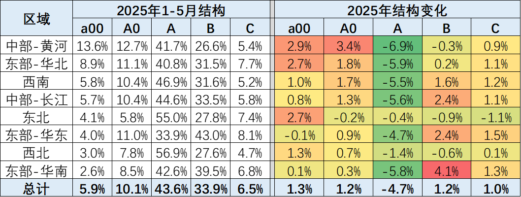 中西部车市好于东部车市,2025年5月西部地区车市份额较上年同期增加1.1个百分点。而中部的黄河地区车市有所回暖,中部车市份额较上年同期增加0.8个百分点。中部地区分化,也是北强南弱格局,5月的中部长江地区从12.9%下降到12.7%的水平,而中部黄河地区车市较强。