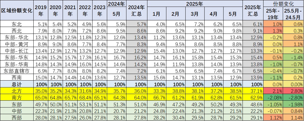 从过去几年各地车市的发展状态来看,北强南弱格局持续,北方车市2025年5月较上年同期的份额增加2.8个百分点,2025年较2019年的北方份额增2.1个百分点。东北地区车市这几年在不断的走强之中,从2023年到2024年逐步的较好增长,2025年5月仍然保持在6.5%份额的较高位水平。南方经济好,但车市较差,华东地区的5月车市同比下滑较大,华南也较差。