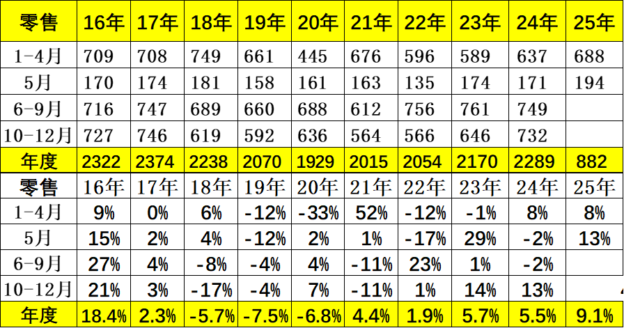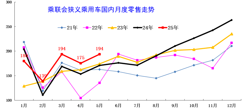2025年5月全国乘用车市场零售193.2万辆,同比增长13.3%,环比增长10.1%。今年累计零售881.1万辆,同比增长9.1%。前几年国内车市零售呈现“前低后高”的走势,今年5月零售较2018年5月181万的最高水平增长6%,呈现超强增长态势。