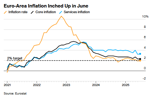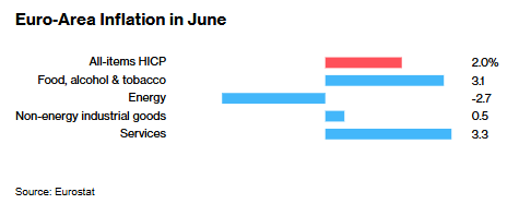欧盟统计局周二公布数据显示,消费者价格指数同比上涨2%,较5月的1.9%略有回升,与预期中值完全吻合。核心通胀率如预期维持在2.3%,而备受关注的服务业通胀指标则微升至3.3%。