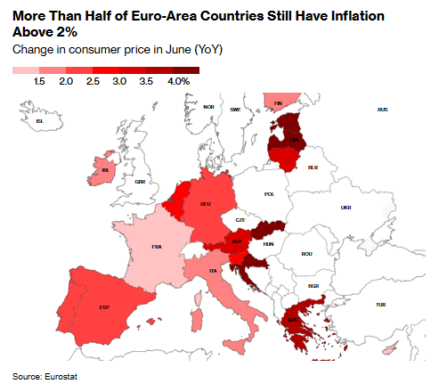 欧元走强与能源成本下降正有效抑制物价上行压力,而欧元区20国经济整体疲软的态势同样构成制约因素。6月数据显示,德国通胀意外放缓,法国与西班牙略有回升,意大利则保持稳定。