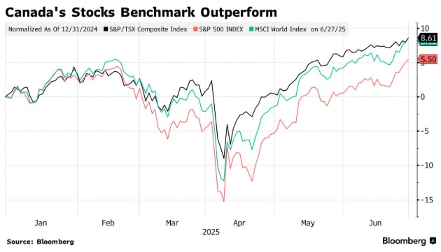 截至6月30日,标普/多伦多证券交易所综合指数年内上涨8.6%,高于标普500指数同期5.5%的涨幅。以美元计算,多伦多指数上涨15%,与全球其他黄金权重较高的指数涨幅相当。