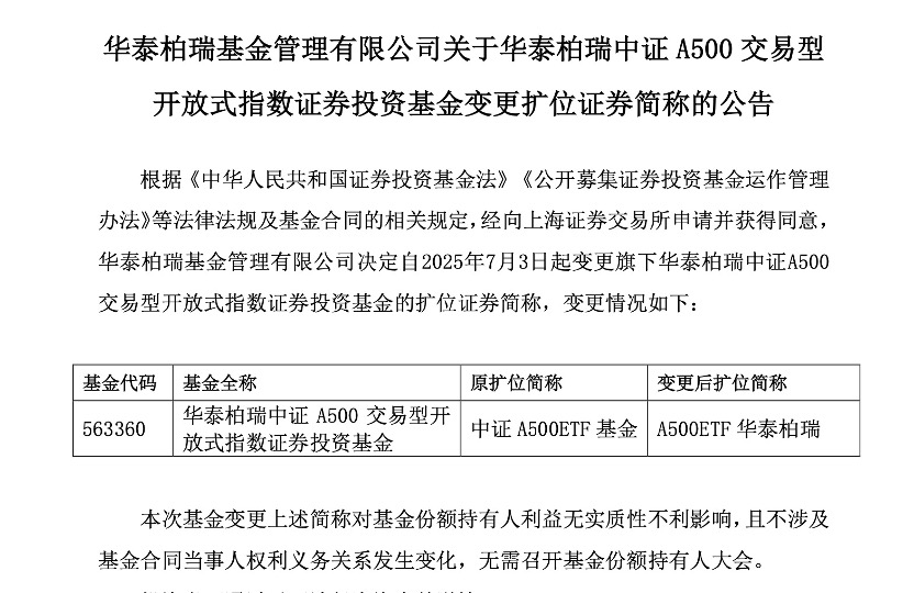 7月1日晚间,华泰柏瑞基金公告,自7月3日起,旗下华泰柏瑞中证A500ET的扩位证券简称正式变更为“A500ETF华泰柏瑞”,采用“标的指数+ETF+管理人名称”三要素命名格式,方便投资者快速提炼核心信息,提升筛选和决策效率。