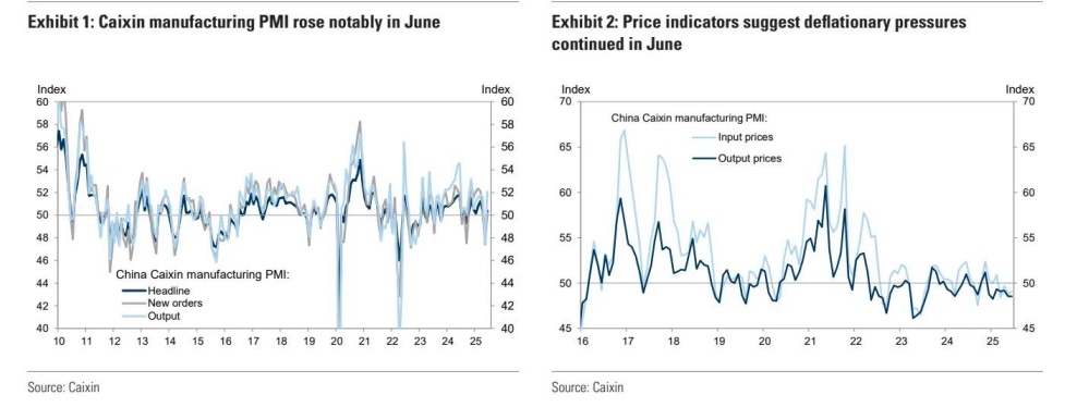 智通财经APP获悉,高盛发布研报称,将美联储联邦基金利率降息预测上调至年内三次(此前为一次),预计9月、10月和12月会有三次降息,且仍预计2026年还会有两次25个基点的降息,因此将终端利率预测下调至3%-3.25%。同时,中国6月财新制造业PMI显著回升至50.4,大幅超出市场预期。
