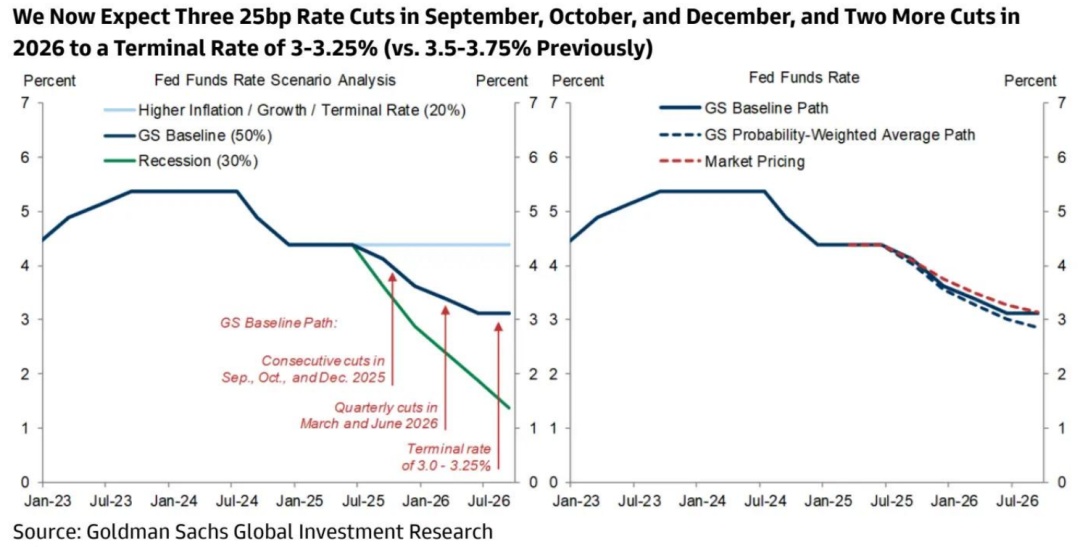 高盛预计9月、10月和12月会有三次降息,且仍预计2026年还会有两次25个基点的降息,因此将终端利率预测下调至3%-3.25%(此前为3.5%-3.75%)。