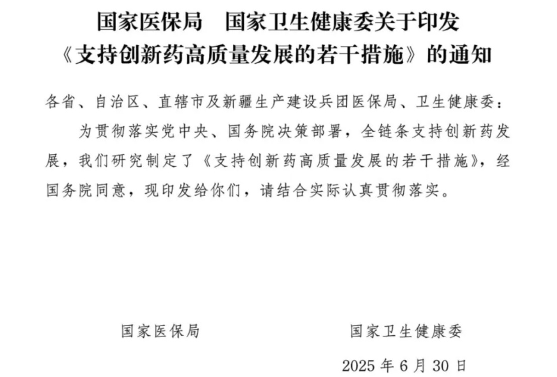 6月30日,国家医保局、国家卫生健康委联合印发了《支持创新药高质量发展的若干措施》,聚焦创新药研发、准入、临床应用及支付全链条,从加大创新药研发支持力度、支持创新药纳入基本医保药品目录和商业健康保险创新药品目录、支持创新药临床应用、提高创新药多元支付能力以及强化保障措施5个方面,提出支持引导中国创新药高质量发展的具体举措。