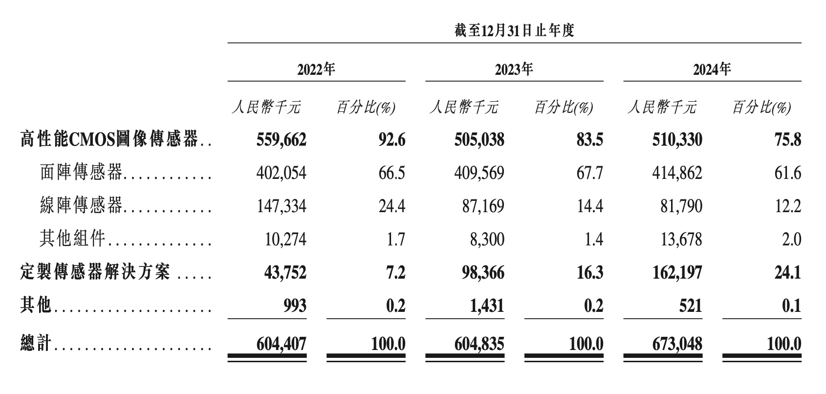 在这样的背景下,高性能CMOS图像传感器的营收占比也呈现波动下滑态势,从2022年的92.6%下滑至2024年75.8%。