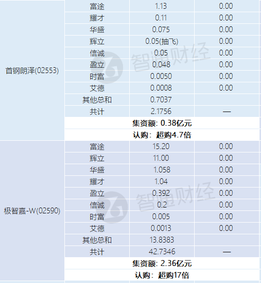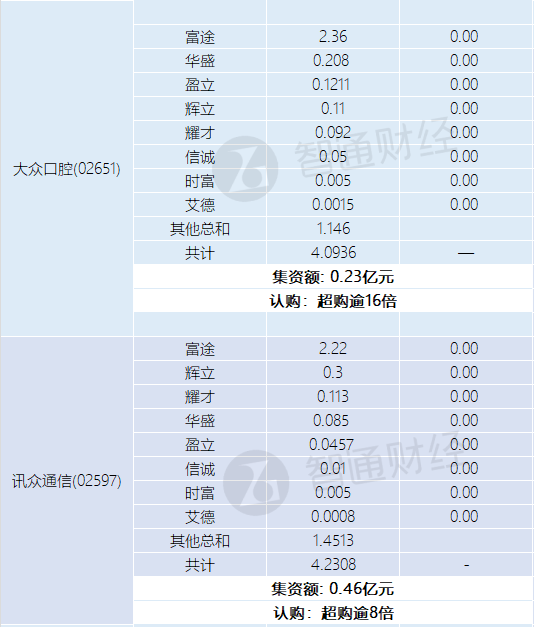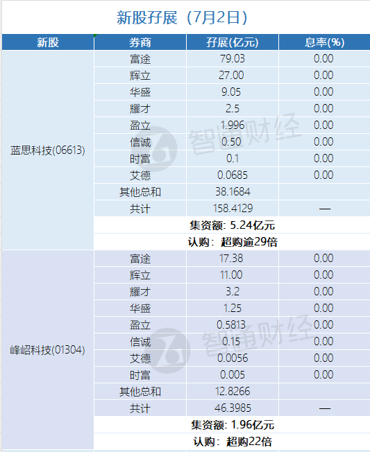 智通财经APP获悉,蓝思科技(06613)、峰岹科技(01304)、大众口腔(02651)、讯众通信(02597)、首钢朗泽(02553)、极智嘉-W(02590)正在招股中。截止7月2日,富途、辉立、耀才等券商合计为蓝思科技借出158.4129亿港元,超购逾29倍;合计为峰岹科技借出46.3985亿港元,超购逾22倍;合计为大众口腔借出4.0936亿港元,超购逾16倍;合计为讯众通信借出4.2308亿港元,超购逾8倍;合计为首钢朗泽借出2.1756亿港元,超购逾4.7倍;合计为极智嘉-W借出42.7346亿港元,超购逾17倍。