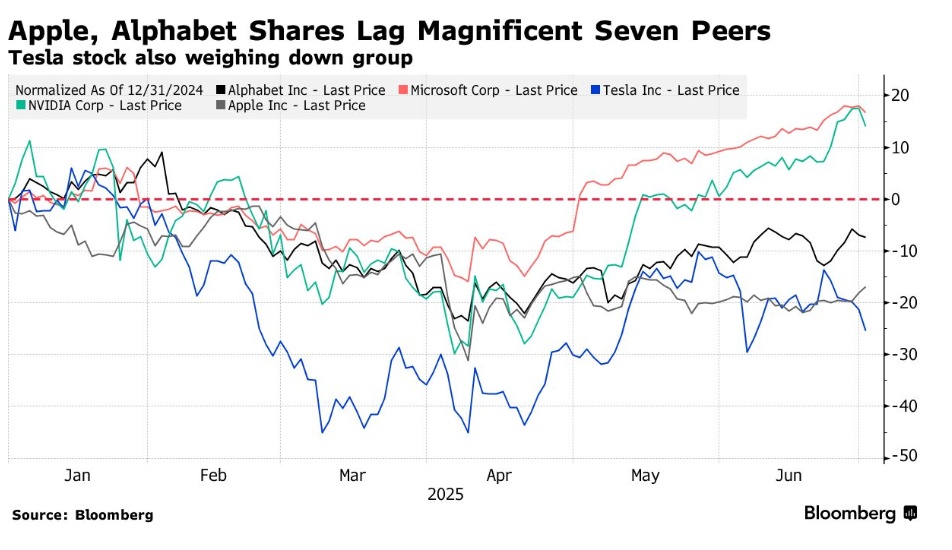 智通财经APP获悉,近期投资者热议:若标普500指数中市值占比较高但股价轨迹萎靡的科技巨头们摆脱颓势,基准指数将获得多大提振空间?受关税阴云与AI业务推进阻力双重夹击,以3.2万亿美元市值位列标普500成分股第三的苹果公司(AAPL.US)年内累计下跌17%;互联网广告巨头谷歌母公司Alphabet(GOOGL.US)因市场担忧AI聊天机器人冲击其核心搜索业务,股价承压7%,当前市值维持在2.1万亿美元;电动汽车龙头特斯拉(TSLA.US)受需求端剧烈波动拖累,年内跌幅达26%。