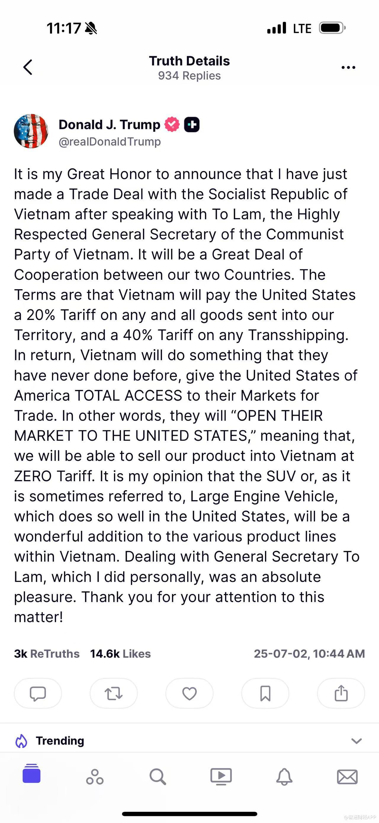 特朗普在声明中写道:“我非常荣幸地宣布,在与越南总书记苏林通话后,我刚刚与该国达成了一项贸易协议。这将是我们两国之间伟大的合作。协议条款为:越南将对所有出口至美国的商品缴纳20%的关税,而对于转运的商品将缴纳40%的关税。作为回报,越南将首次给予美国完全进入其市场的机会,也就是说,美国商品可以零关税的待遇出口到越南。”