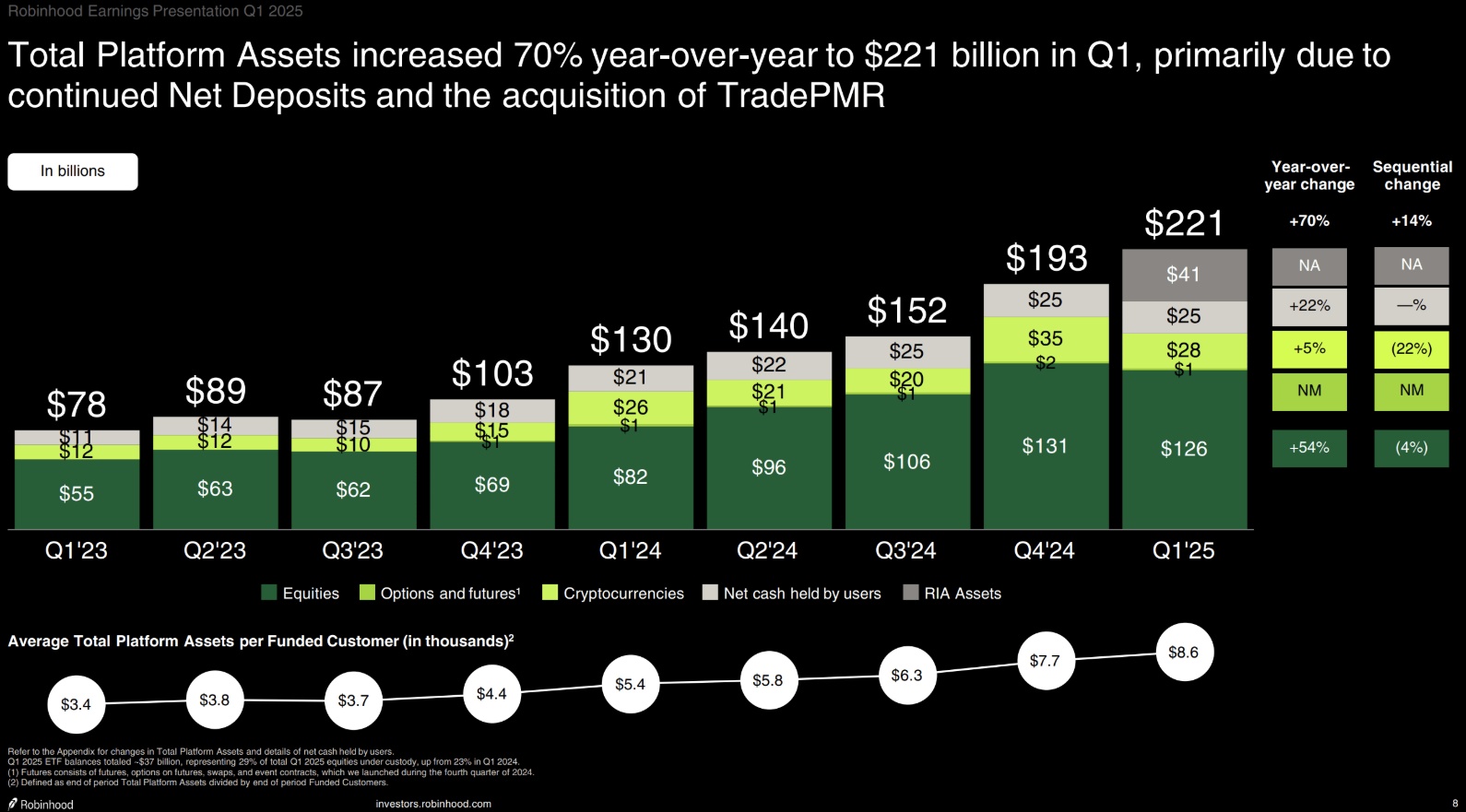Robinhood最近在第四季度/第一季度期间收入跃升至6.1亿美元,年化率超过10亿美元。该公司报告称其一季度的加密货币名义交易额为460亿美元,远高于SoFi在2023年底持有的有限余额。