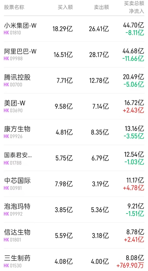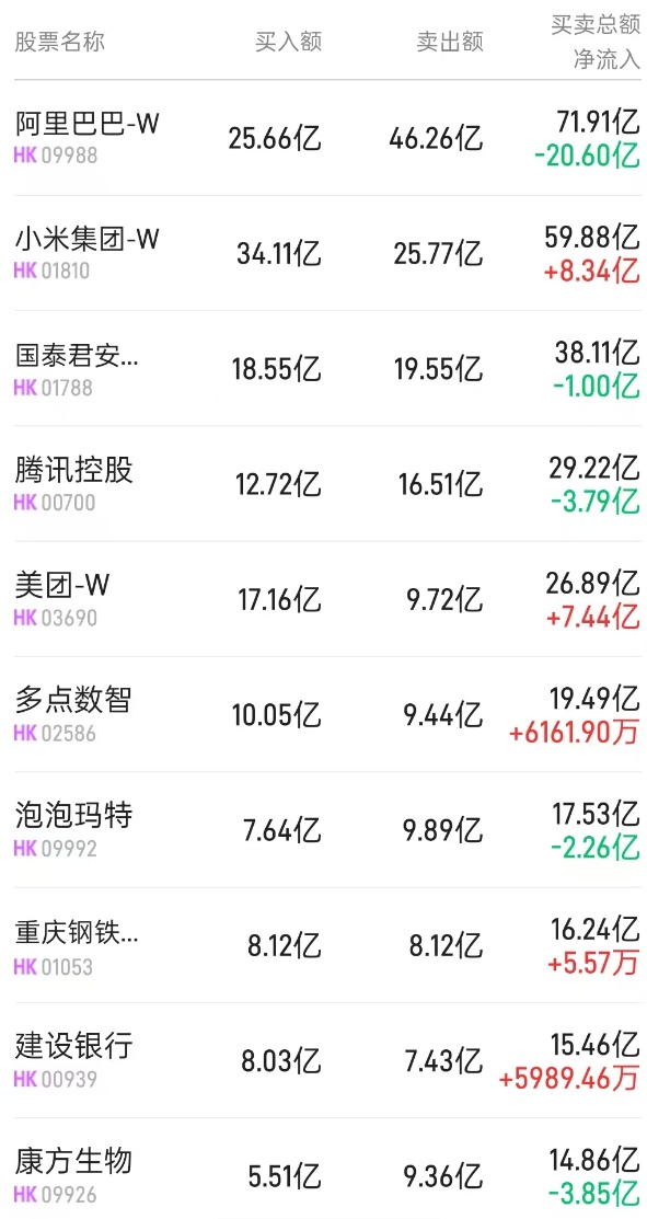 此外,建设银行(00939)获净买入5989万港元。而腾讯(00700)、国泰君安国际(01788)分别遭净卖出8.85亿、2.03亿港元。