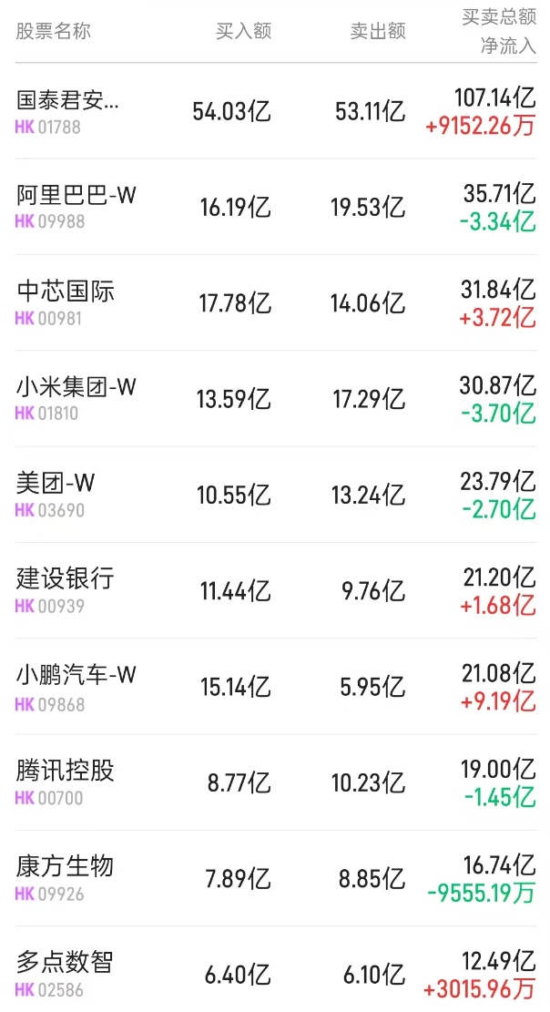 北水净买入最多的个股是小鹏汽车-W(09868)、中芯国际(00981)、建设银行(00939)。北水净卖出最多的个股是阿里巴巴-W(09988)、小米集团-W(01810)、腾讯(00700)。