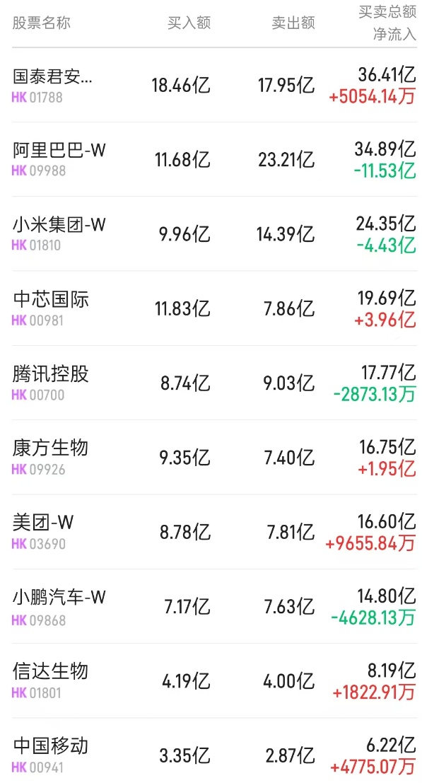 此外,建设银行(00939)、中国移动(00941)分别获净买入1.67亿、4775万港元。而小米集团-W(01810)、腾讯(00700)分别遭净卖出8.13亿、1.74亿港元。