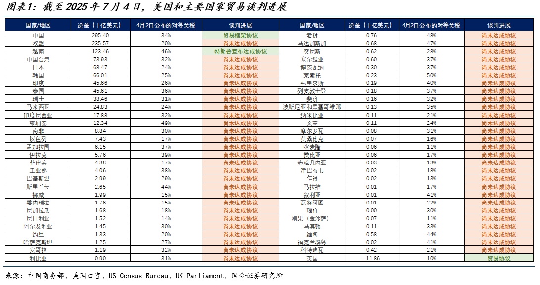 美国为了达成贸易协定去除不确定性,放松贸易谈判条件;非美国家为了尽快达成贸易协定,答应美国诉求;特朗普政府对于未达成贸易协定的国家直接拉高关税。