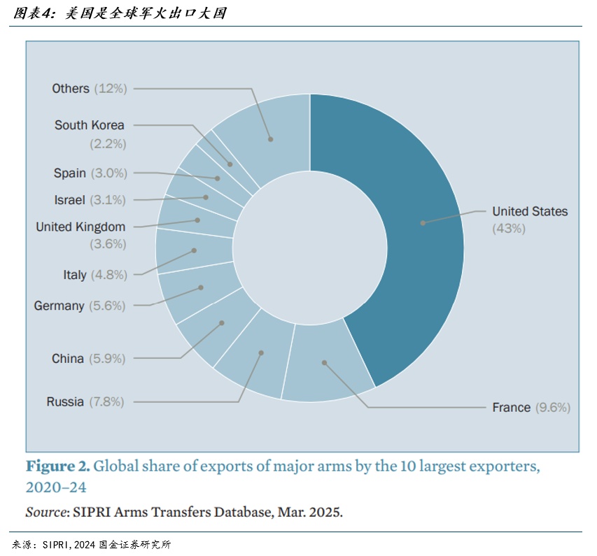 北约增加国防开支将直接带动新一轮军备采购,这将为美国军工企业创造商机。美国是全球最大的军火出口国,主要依赖两大市场:北约成员国和中东盟友。欧洲在2020-2024年间以35%的占比,二十年来首次超越中东(33%),成为美国武器出口的最大目的地。