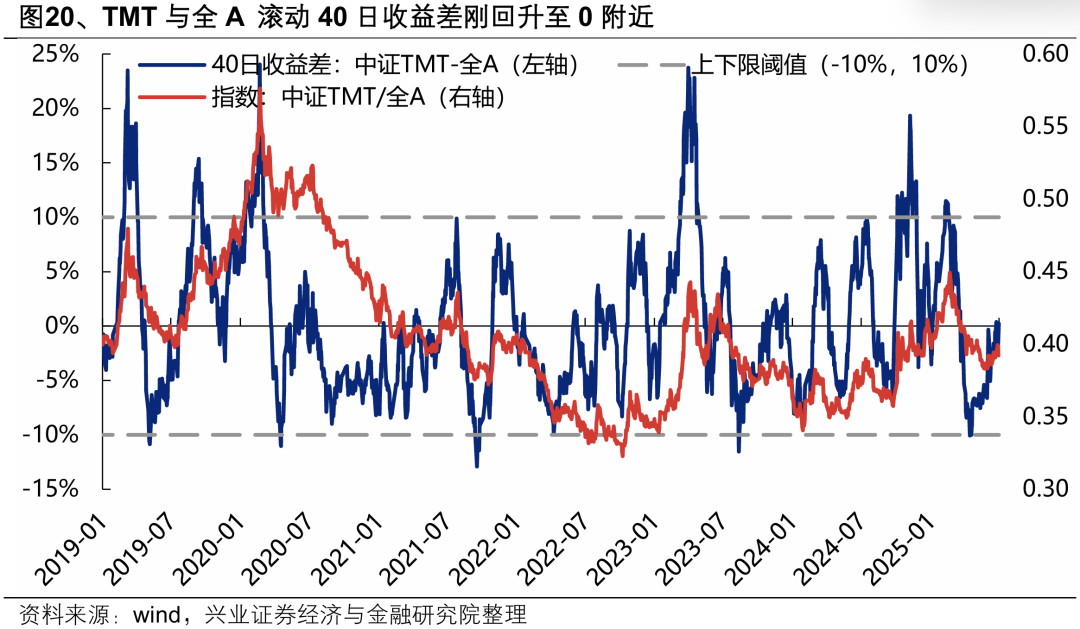滚动收益差看,TMT与全A滚动40日收益差刚回升至0附近,相对市场并未积累较多超额收益。