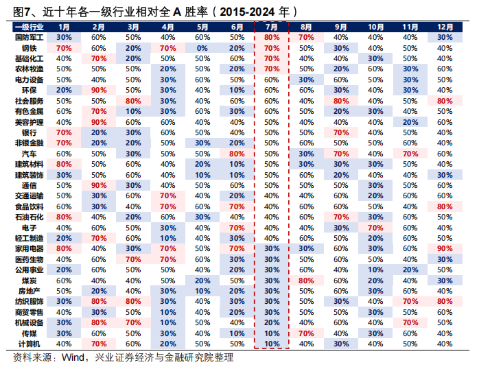 从各行业看,7月胜率较高的方向主要集中在以军工、新能源为代表的成长板块,以及钢铁、化工、有色等资源品,背后是旺季、业绩、政策预期等因素的共同驱动。