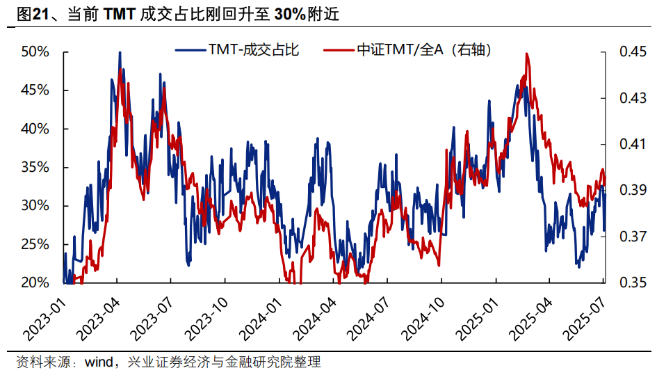成交占比看,当前TMT成交占比刚回升至30%附近,仍显著低于45%左右的过热区间。