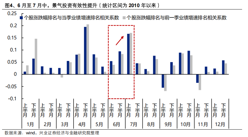 随着中报业绩预告陆续披露,7月是全年最看业绩的月份之一,市场将更加注重交易现实,关注基本面的兑现,景气投资或更加有效。该行统计了全年各个月份市场涨跌幅排名与业绩增速排名的相关性,可以看到,随着中报业绩预告陆续披露,6月至7月中景气投资的有效性提升,7月上半月市场对当期业绩的关注程度仅次于4月下半月(年报&一季报)。未来一段时间,业绩或将再度成为超额收益的胜负手。