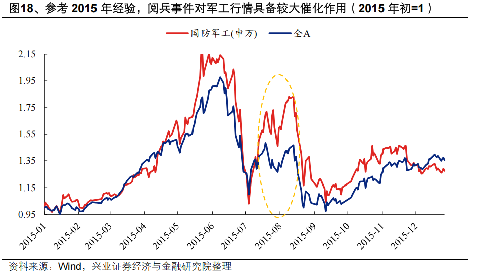 另一方面,参考历史经验,阅兵等事件将对军工行情构成重要催化。阅兵作为展示国家军事实力的重要时刻,是推动军工板块上涨的重要催化剂。回顾2015年9月3日的世界反法西斯战争胜利70周年大阅兵,7月9日起军工板块行情就开始反映阅兵事件的预期,至8月17日区间收益为78%,相对全A超额收益45%。未来一段时间,军工板块或处于事件催化的上涨预期之中。