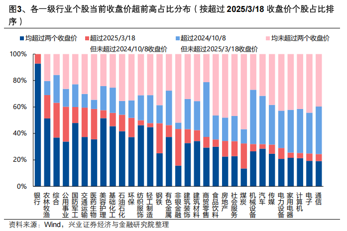 各行业股价分布看,本轮上证综指新高主要由银行贡献,各行业分化依然较为明显,尤其是TMT、新能源、汽车、机械等科技成长板块中仍有大量个股收盘价未突破3/18前高。