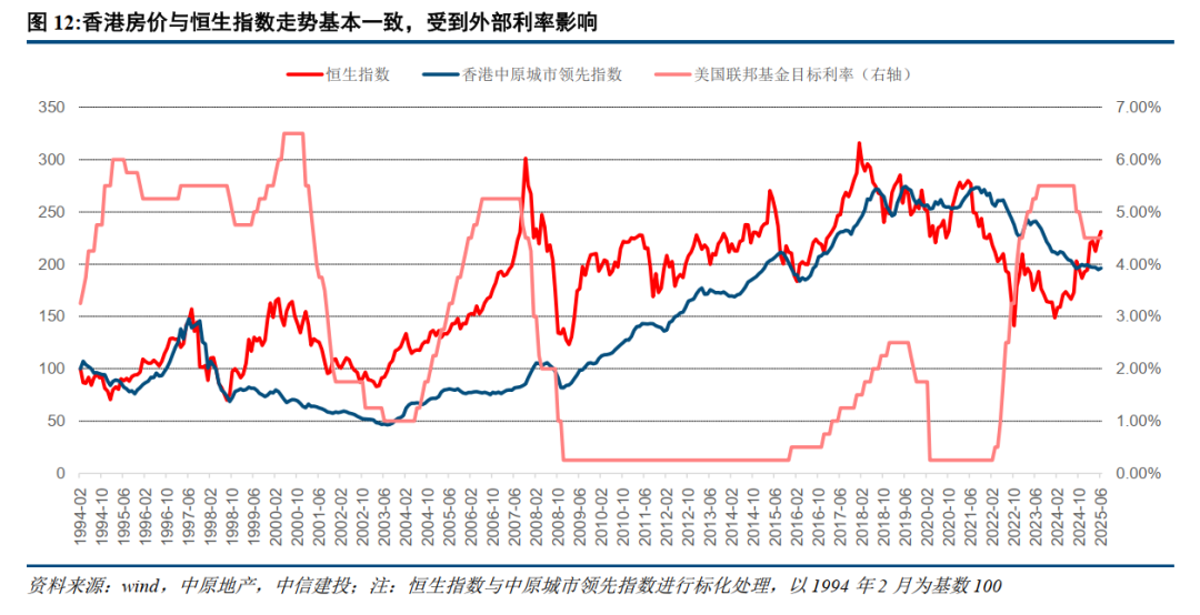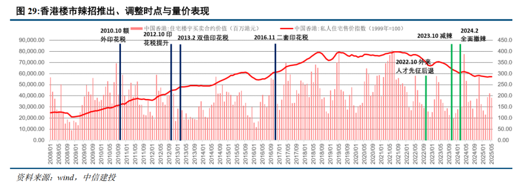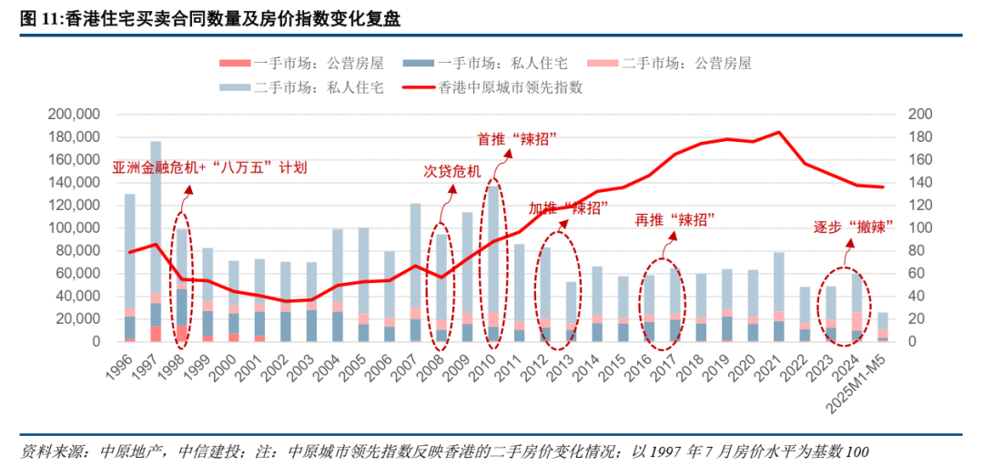 香港房地产市场经历多轮周期,当前出现止跌回稳势头。2021年以来香港楼市出现明显调整,当前房价较2021年高峰下跌约26%,相当于2015年水平。在恒指回升与撤辣的共同作用下,当前交易量价出现企稳,2025年前5月住宅成交量较上年同期基本持平,2025年上半年末房价仅较2024年年底微降1%。