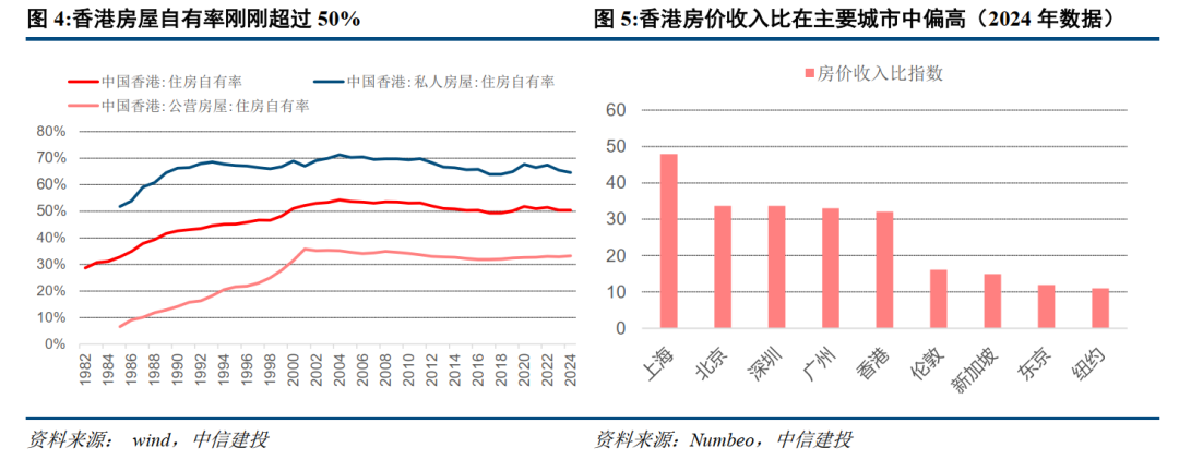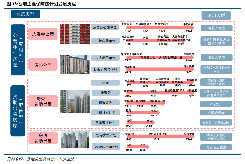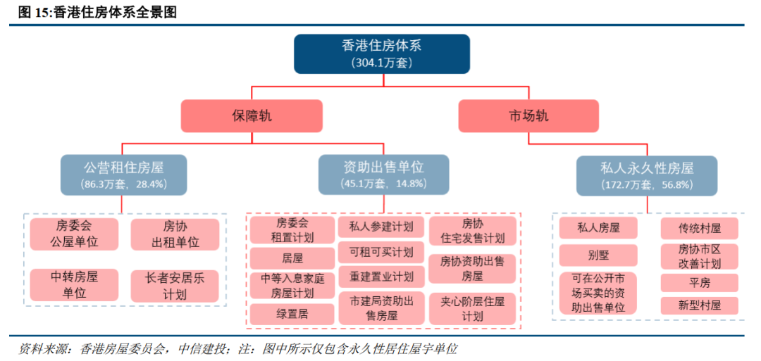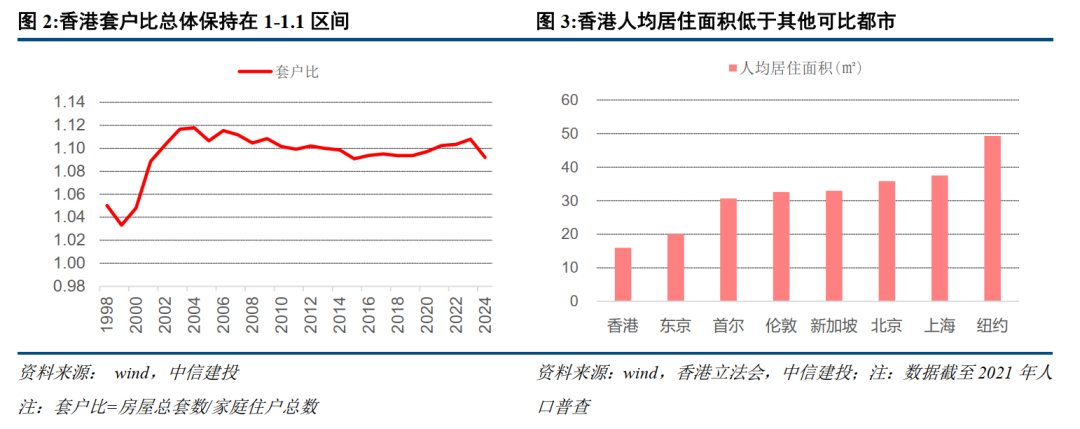 供给侧:住房保障体系租售并举,住房矛盾依然突出。香港地狭人稠,人均居住面积仅16平不及新加坡的一半。香港住房供给采用双轨制体系。截至2024年,香港市场化的私人住宅共约172.7万套,占比56.8%;保障房租售并举,配租和配售型分别86.3万套和45.1万套,占比分别为28.4%、14.8%。最新数据显示香港配租型保障房的轮候年限长达5.3年,住房矛盾依然突出。