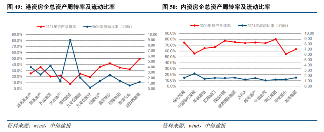 香港房企:存量转型成功,“两低一高”保障高质量经营。代表性港资房企呈租售混合的特点,在商业地产领域强于精耕细作,物业租赁收入占比平均达52%,较内房显著更高。此外港房通过跨界布局多元化业务,反哺主业产生协同效应。港房在财务层面实现了低杠杆、低周转、高利润率的特征,2024年头部港资房企的平均毛利率为54%,资产负债率为29%,流动比率约为2.6,经营更加稳健。