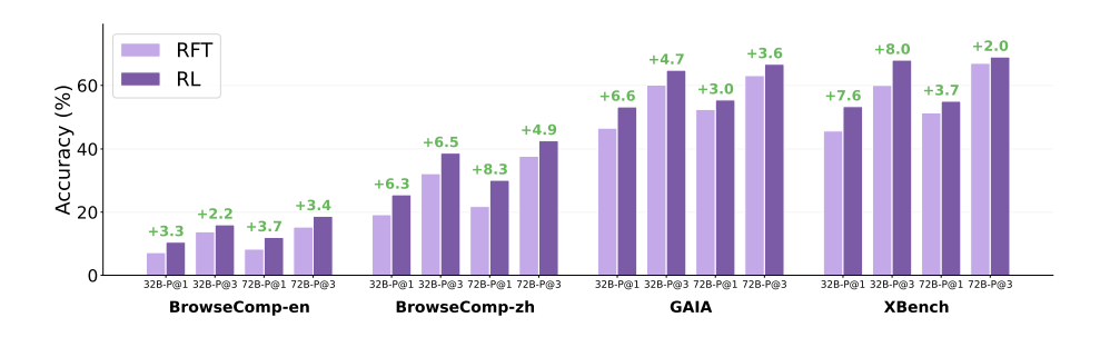 在权威评测平台 BrowseComp-en / BrowseComp-zh 中:WebSailor-72B 得分高居开源榜首;中文榜单中,与豆包(Doubao-Search)不分上下;更在英文榜单中 超过 Grok-3 等闭源模型。不仅如此,它在相对简单任务(如SimpleQA)中也表现优异。