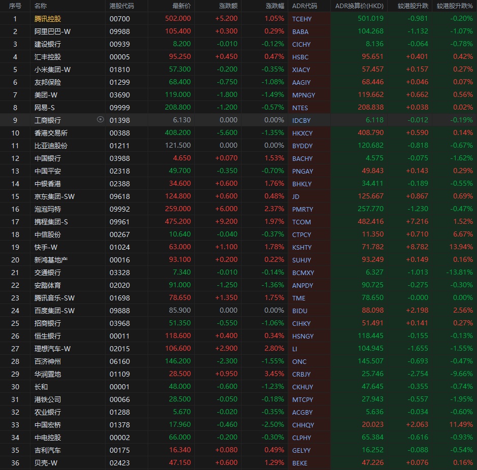 大型蓝筹股涨跌互现,汇丰控股收报95.651港元,较香港收市涨0.42%;腾讯控股收报501.019港元,较香港收市跌0.20%。