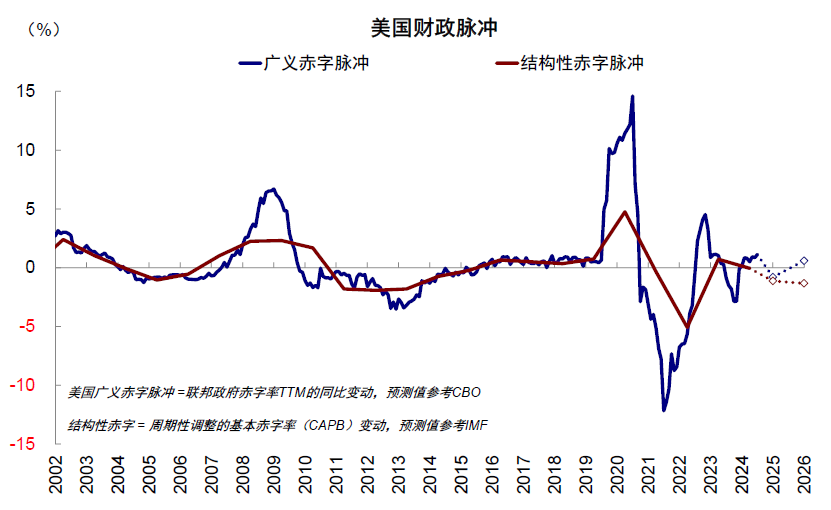 图表:美国2025财年广义赤字脉冲或转负,2026财年改善至0.6%