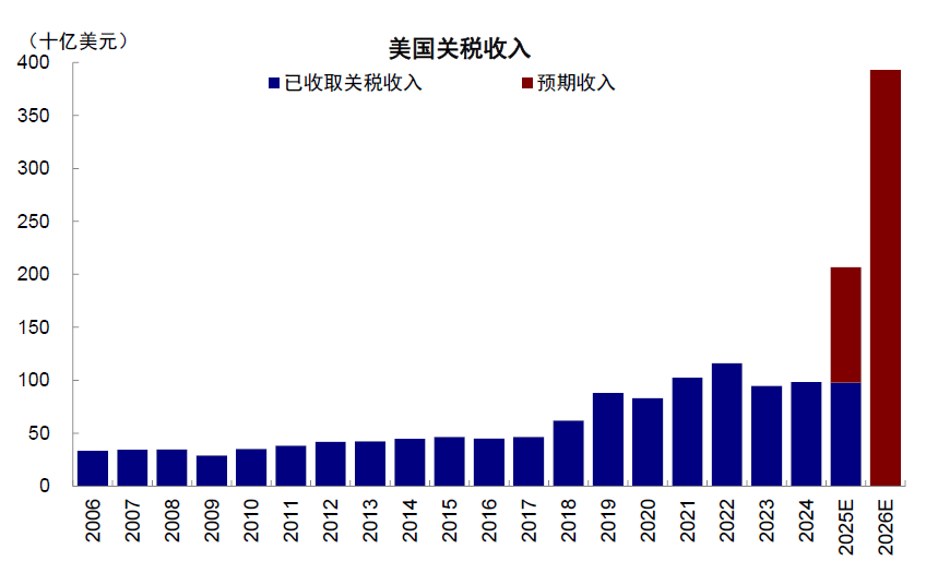 另一方面,关税收入的增加可以大部分抵消支出,未来几年赤字率基本维持在6%左右。根据CBO预测,“大美丽”法案预计在未来10年增加3.4万亿美元基本赤字,包含利息支出的总赤字为4.1万亿美元,高于众议院早先版本(基本赤字2.4万亿美元)。参考CBO的预测,2026财年赤字约增加4790亿美元,但得益于每年3000~4000亿美元的关税收入可以抵消大部分,赤字率从2025财年5.2%升至2026财年的5.9%,未来几年赤字率基本维持在6%左右。