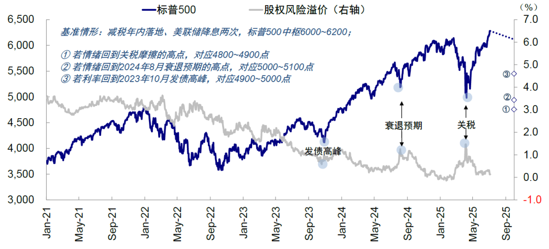中期看,短期流动性冲击不改变长期观点,波动反而提供配置机会。1)冲高的美债会使得金融条件收紧,再加上美联储降息,都可以提供再配置机会。基准情形下,我们预计美联储年内可以降息两次,对应美债中枢4.2%左右。当前美国实际利率(1.78%)仍比自然利率(1%)高0.78ppt,意味着美联储本就需要降息。只不过关税谈判尚未落地,因此节奏上或需等到9月关税落地、不确定性消退后方可开启降息。2)美国信用周期的重新启动,是美股主要支撑和动力,得益于AI投资的强劲、政府财政脉冲的环比改善,以及降息后美国私人部门传统需求的重启。基于年内降息2次、盈利增速回升至9%(减税部分抵消关税拖累),我们测算标普500指数中枢对应6000~6200点。