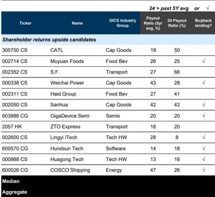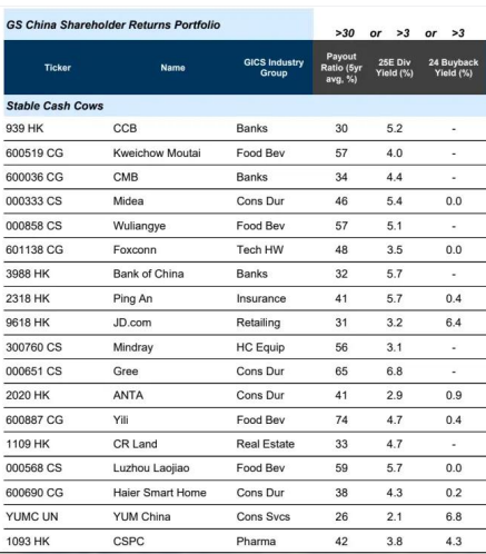 包含 16 个 GICS 行业组的 30 只高盛买入评级股票,选择积极回报现金或响应政策提高股息 / 参与回购再贷款计划的公司。