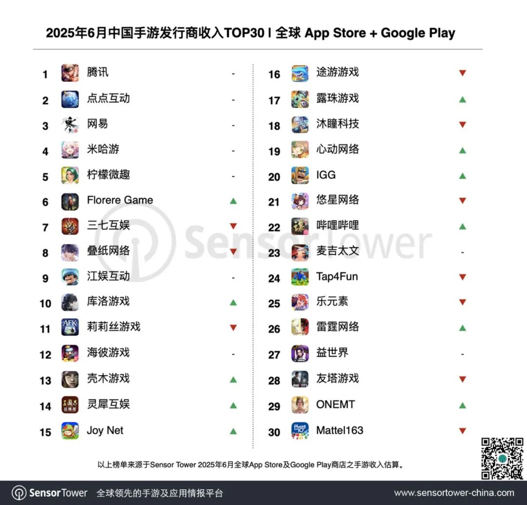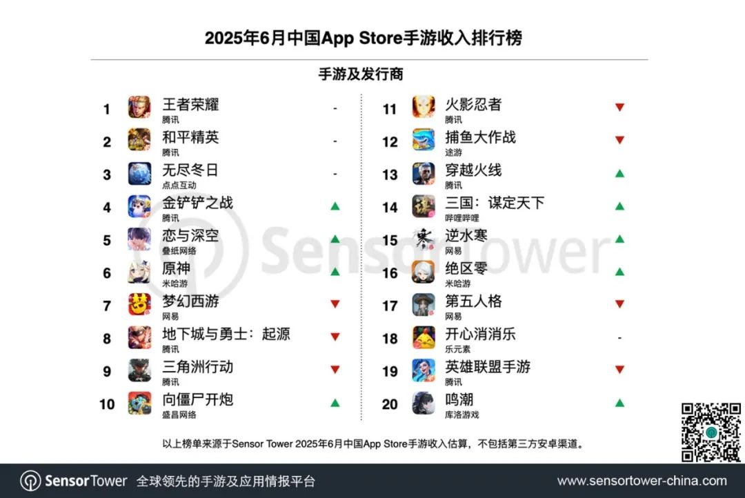2025年6月,腾讯(00700)《王者荣耀》、《和平精英》与点点互动《无尽冬日》稳居中国App Store手游收入榜前3名。