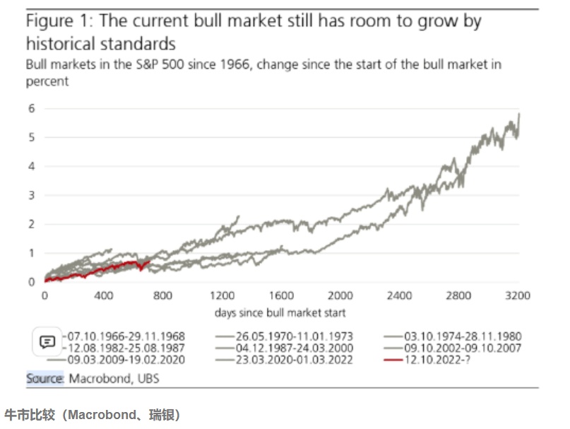 智通财经APP获悉,根据瑞银研究报告与标普500官方数据交叉验证,当前美股牛市呈现出历史罕见的长周期特征。自2022年10月12日启动的本轮行情已持续33个月,较1987-2000年那轮12.3年(582%收益率)的超级牛市尚有差距,但已突破NDR统计的长期牛市平均1105天(约3年)生命周期,进入中期阶段。标普500历史数据显示,典型牛市平均涨幅达156%,中位数101%,而本轮行情累计上涨69%的态势,印证着技术革命与地缘重构的双重驱动。