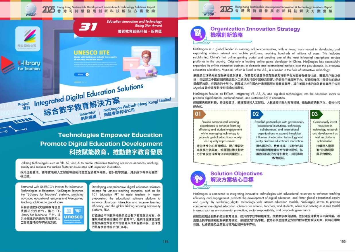 “2025香港可持续发展创新科技大奖”旨在透过嘉奖各行业的机构以及创科人才,以表彰机构因应自身行业和业务范围,将创新科技融入可持续发展理念,以可持续发展为原则,指导解决方案的开发、规划、应用、发展全流程。本届大奖响应国家“十四五规划”及《香港创新科技发展蓝图》,聚焦经济、社会和环境三大层面,涵盖绿色金融、优质教育等九大领域,以及迈向净零碳排放等跨领域解决方案,吸引超过90间机构提交近200个创科项目申请,最终评选出十二个类别的卓越项目。网龙凭借在数字教育领域的技术创新与可持续发展贡献脱颖而出,获得优质教育创新科技领域“机构奖 - 新秀奖”殊荣。